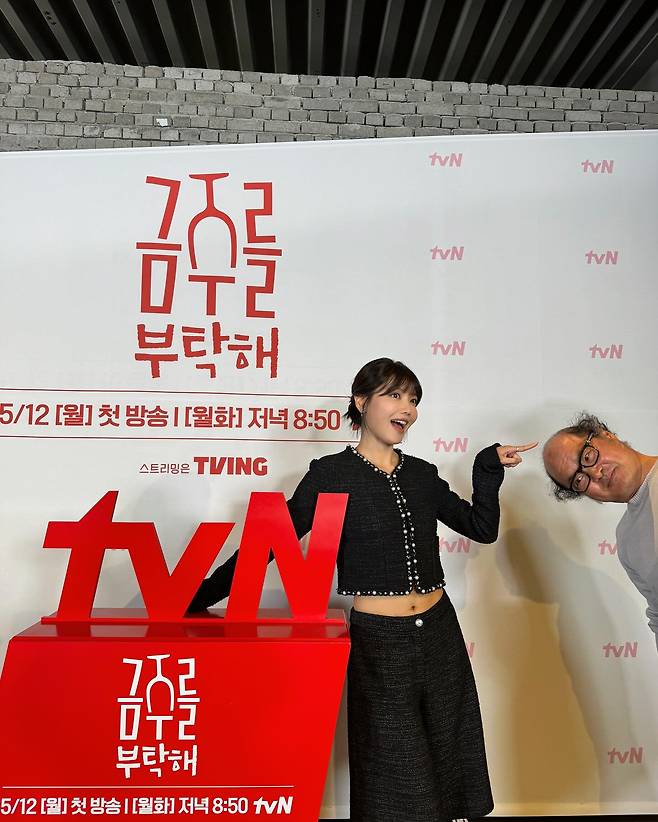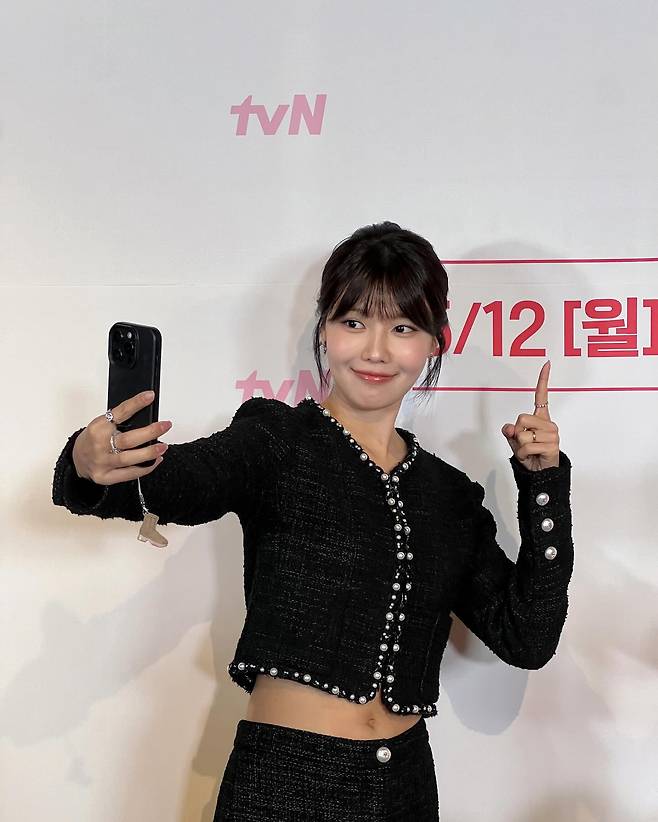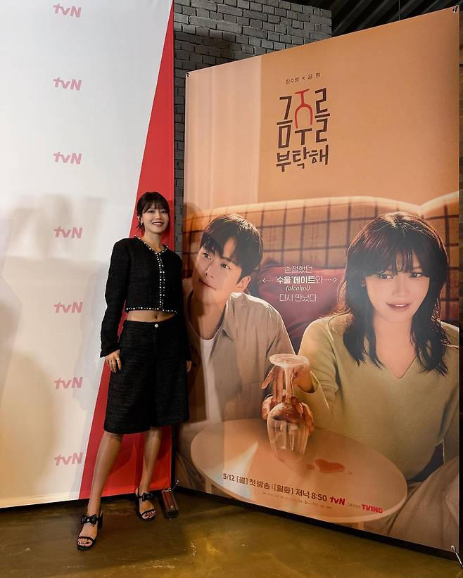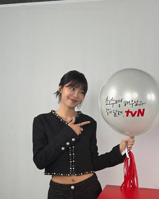 수영이 선택한 오늘의 스타일은 클래식한 블랙 트위드 투피스예요.