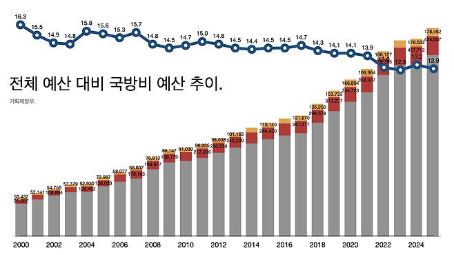 - 전체 정부 재정은 474억 원, 재정 대비 국방비 비중은 12.9%다.