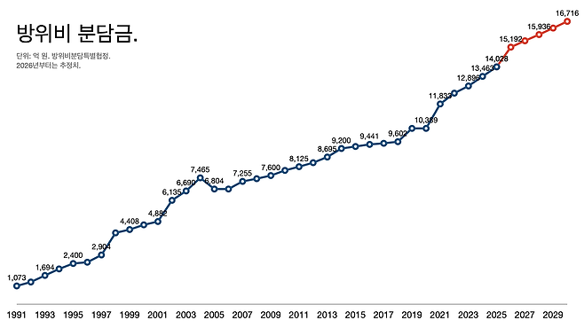 - 한국의 올해 방위비 분담금이 13조 원이니까 9배 이상 늘려야 한다는 이야기다. 이런 말도 했다. “우리는 그들을 북한으로부터 보호하고 있다. 나는 그들과 매우 잘 지냈는데 그들은 아무것도 내지 않았고, 이것은 미친 일이다.”