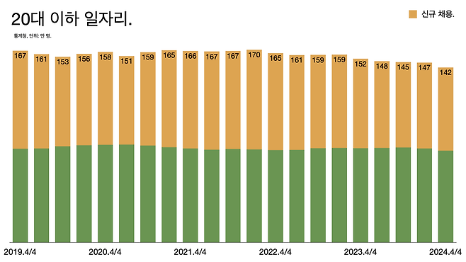 - 300명 이상 기업만 놓고 보면 20대 신규 채용이 2019년 47만 개에서 2023년 40만 개로 줄었다. 일자리도 줄었지만 좋은 일자리는 더 줄었다는 이야기다.