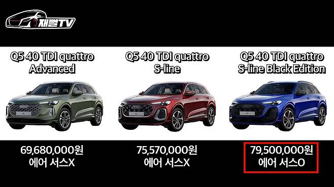 물론 모든 Q5 모델에 에어 서스펜션이 들어가는 것은 아닙니다. 가장 기본 모델(6,968만 원)과 S라인 모델(7,500만 원)에는 에어 서스펜션이 없으며, 오직 블랙 에디션에만 적용되는 점을 꼭 기억해야 합니다. 만약 제가 1년 전으로 돌아갔다면 1천만 원을 더 투자해서라도 Q5 블랙 에디션을 샀을 것이라고 단언할 정도로 에어 서스펜션의 가치를 높게 평가하고 싶습니다.