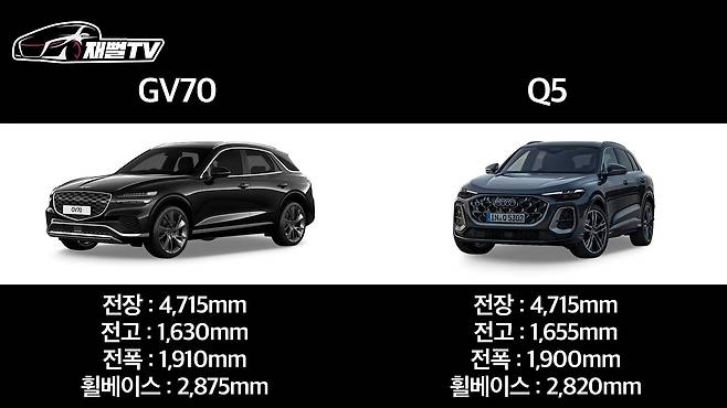 차체 크기를 보면, Q5는 이전 모델보다 전폭이 5mm 넓어졌고 전장이 35mm 더 길어졌습니다. 전체적으로 전폭은 1900~1910mm 정도이며, 전장 길이는 GV70과 거의 동일한 수준을 유지하고 있습니다. 전폭이 넓어져서 실제 차량을 마주했을 때 존재감이 꽤 느껴지는 점이 인상적이었습니다. 차량이 주는 안정감과 웅장함이 한층 더 강화된 느낌이었죠.