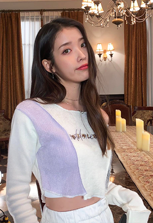 또 다른 사진 속 아이유는 화이트와 연보라 컬러가 믹스된 크롭 니트와 주름 팬츠를 매치해 편안하면서도 사랑스러운 캐주얼룩을 보여줬다.