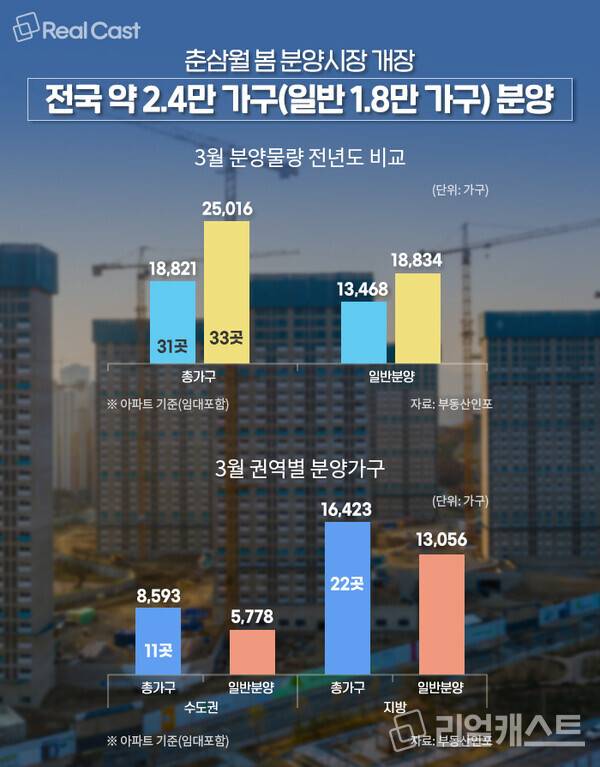지난해 3월은 31곳에서 1만 8,821가구(일반분양 1만 3,468가구)가 분양을 했으니 약 6,000가구가량이 늘어나는 셈입니다.