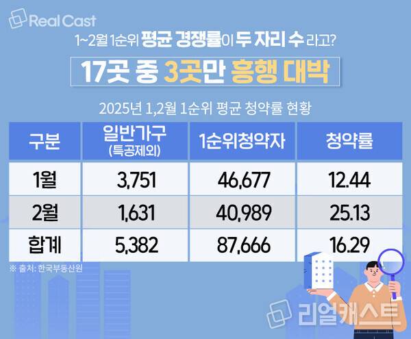 올해 1~2월 사이 전국에서 분양에 나선 민간 아파트는 17곳이며 이중 서울 서초구 래미안원페를라(4만 635명), 전북 전주시 더샵라비온드(2만 1,816명), 충북 청주시 청주테크노폴리스 하트리움 더메트로(1만 4,480명) 등의 3개 단지 정도만 분양에 제대로 성공했을 뿐 나머지 대부분의 단지들은 기대 이하의 성적을 거뒀습니다.
