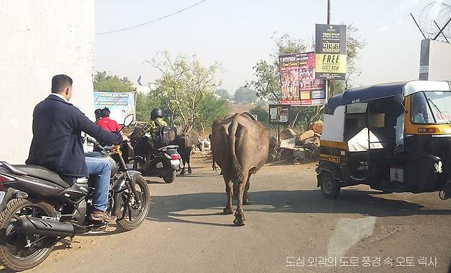 오토 릭샤는 인도의 풍경에서 흔히 보이는 차들이고 그래서 인도 도로의 풍경을 보면 중심가의 대로에서도 덩치 큰 2층 버스와 작은 오토 릭샤가 뒤섞여 다니는 건 물론이고, 약간 외곽으로 벗어나면 도로를 활보하는 야생 소들과 오토바이, 오토 릭샤 등이 거리를 메우고 있습니다.