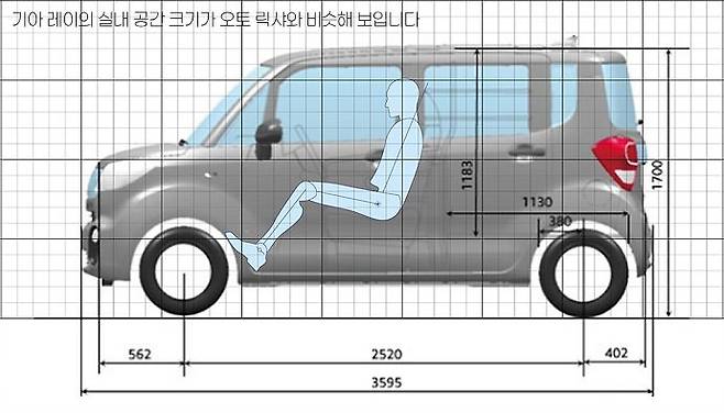 레이는 전장×전폭×전고가 3,595×1,595×1,700(mm) 이고, 축간 거리는 2,520mm로, 우리나라의 경형 승용차 차체 크기와 전폭 규제 1,600mm에 맞추어서 1,595mm로 차체 폭은 우리나라 다른 세그먼트 승용차에 비해 좁지만 릭샤 보다는 넓지만, 실내 높이 확보는 비슷합니다.