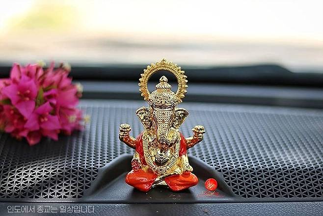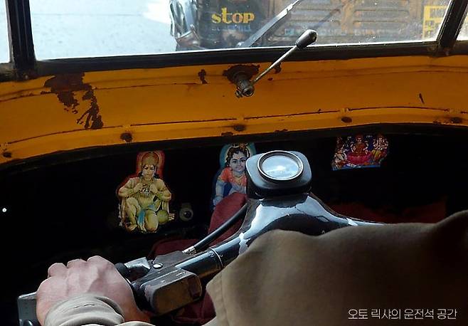 오토 릭샤의 인스트루먼트 패널은 정형화된 형식은 없지만, 2륜 스쿠터와 같은 형태의 핸들 바(handle bar)를 중심으로 전면 방풍 패널 안쪽에 계기류가 설치되고, 선반(shelf) 역할을 하는 구조물이 양쪽에 만들어져 있습니다. 여기에 대개는 작은 신상(神像)을 붙여 놓습니다. 인도 사람들에게 힌두교는 종교이기보다는 삶의 기본 철학 같습니다.