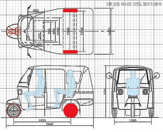 제조업체에 따라 오토 릭샤의 크기와 형태는 다양하지만, 대체적인 치수는 차체 길이가 3,000mm 범위에 있으며, 차체 폭은 최대 1,470mm, 높이는 1,920mm까지 분포하는 것을 볼 수 있습니다. 여기 보여드리는 도면 분석 그림은 「바자즈」에서 제조한 오토 릭샤를 100mm 간격 그리드에서 좌석에 서구 기준 95 백분위 인체 모형(SAE 95%ile)을 적용한 것입니다.