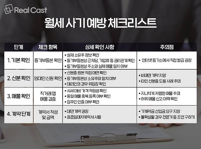 그렇다면 월세 사기를 예방하려면 어떻게 해야 할까요? 전문가들은 임대차 계약 전, 사전에 다양한 관련 정보를 꼼꼼하게 확인할 것을 권하고 있습니다.