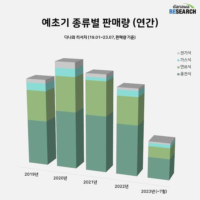예초기는 크게 충전식, 연료식, 가스식, 전기식으로 구분된다. 이 중에서 2019년부터 2023년 7월까지 가장 많은 소비자들의 선택을 받은 예초기는 바로 충전식. 전기로 배터리를 충전해 작동시키는 충전식 예초기는 무게가 가볍고 매연이 없어 사용하기가 편리하며, 휴대 및 보관 뿐만 아니라 유지 관리하기도 쉬워 소규모 벌초나 잔디 깎기 용으로 인기를 끌고 있다.