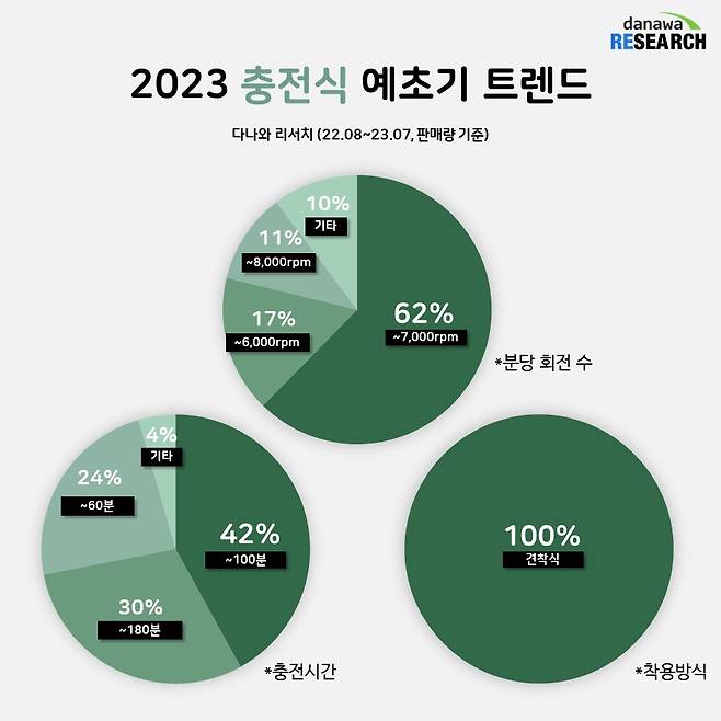 2022년 8월부터 2023년 7월까지 최근 1년간 판매된 충전신 예초기들 중 가장 많은 소비자가 선택한 분당회전수는 무려 62% 점유율을 차지한 ~7000rpm. 2위는 17% 점유율을 차지한 ~6000rpm, 3위는 11% 점유율을 차지한 ~8000rpm이었으며, ~9000rpm 및 9000rpm 이상 분당회전수를 가진 제품들도 각각 5%, 3% 점유율을 차지해 판매량이 많지는 않지만 수요가 있음을 확인할 수 있다.