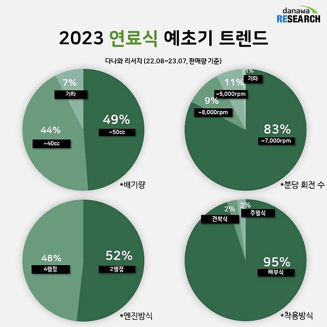 분당회전수는 충전식 예초기와 마찬가지로 ~7000rpm이 83% 점유율로 가장 높은 판매량을 보여줬으며, 그보다 높은 ~8000rpm이 9% 점유율로 2위에 올라 충전식 예초기에 비해 높은 성능을 자랑했다. 한편, 분당회전수가 5000rpm 이하인 제품은 7%에 불과했다. 보통 8~10kg 무게를 가진 만큼 착용방식은 배부식이 95%로 압도적인 점유율을 보였으며, 엔진의 힘을 나타내는 배기량은 ~50cc가 49%, ~40cc가 44%로 양분하고 있다.