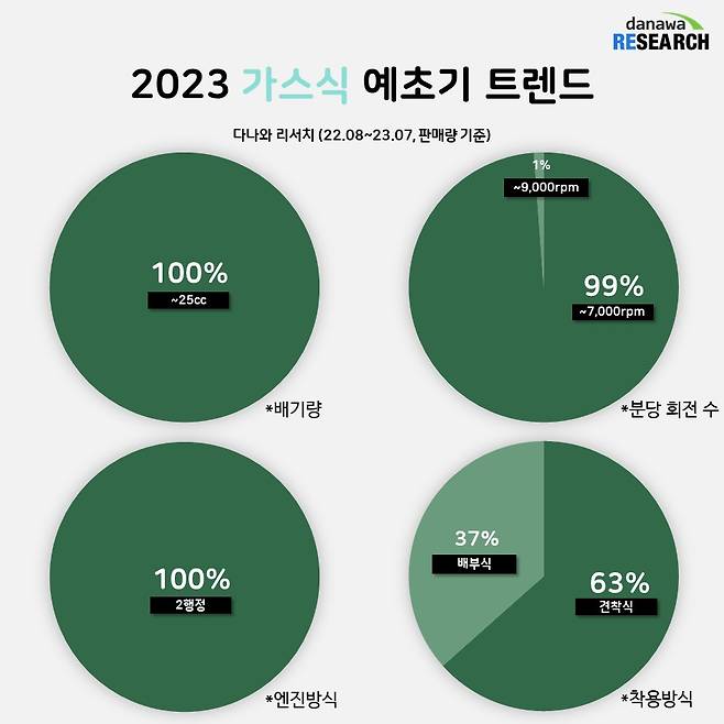 부탄가스로 작동하는 가스식 예초기는 연료식과 충전식의 중간 단계에 위치하는 예초기로, 적당한 힘과 무게를 가지고 있어 사용하기 무난하다. 다만 연료식 만큼 힘이 강하지 않고 충전식 만큼 간편하지도 않다 보니 점유율은 다소 떨어지는 편. 최근 1년간 판매된 가스식 예초기는 100% 2행정이며, 분당회전수도 ~7000rpm이 99% 점유율을 보였다. 배기량 역시 ~25cc가 100% 점유율을 차지해 가스식 예초기 시장에 확고한 구매 기준이 있음을 알 수 있다. 무게는 5~7kg 선으로 견착식이 63%, 배부식이 37% 점유율을 보였다.