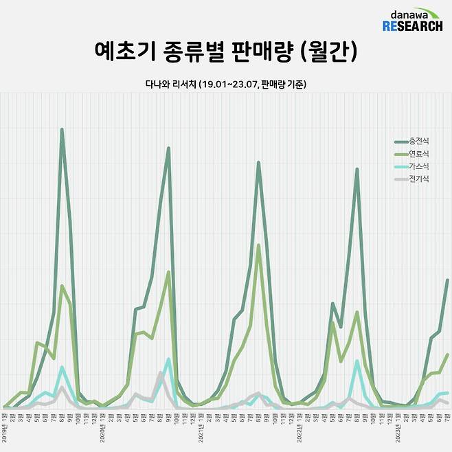 예초기가 가장 많이 판매되는 시즌은 언제일까? 2019년 1월부터 2023년 7월까지 차트를 살펴보면, 매년 7월부터 예초기 판매량이 급증하는 것을 알 수 있다. 추석을 앞두고 벌초를 위해 예초기를 구입하는 사람들이 늘어나기 때문이다. 날씨가 따뜻해지는 5월부터 점점 증가하는 예초기 판매량은 7월부터 급증해 8월에 정점을 찍고, 추석이 지난 9월부터 다시 급격하게 줄어들어 겨울에는 거의 판매되지 않는다. 올해 역시 지난 달부터 예초기 판매량이 늘어나고 있으며, 곧 피크를 찍게 될 전망이다.