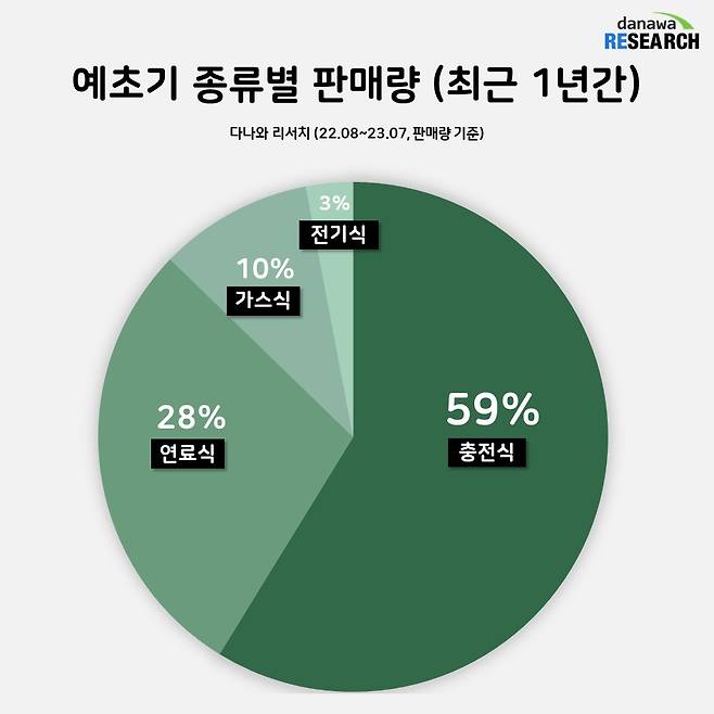 2022년 8월부터 2023년 7월까지 판매된 예초기 중 충전식 예초기 점유율은 59%. 휘발유를 넣어 사용하는 연료식 예초기가 28% 점유율로 뒤를 이었으며, 부탄가스를 연료로 하는 가스식 예초기가 10%, 전원을 연결해 사용하는 전기식 예초기가 3% 점유율을 차지했다. 가장 많은 사람들이 사용하는 충전식, 연료식, 가스식 예초기 차트를 살펴보며 종류별 특징과 트렌드를 알아보자.