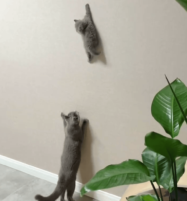 이날 장난꾸러기 새끼 고양이는 집에서 새로운 세상을 발견하고 벽에 올라가서 놀았습니다.