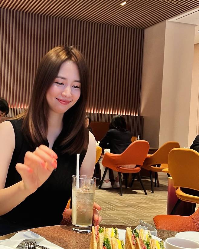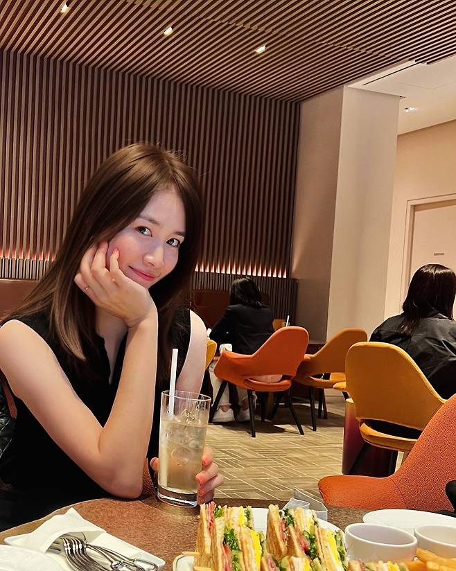 잔잔한 패턴이 반복되는 레스토랑 공간 속, 오롯이 빛나는 건 진아름의 블랙 룩이에요.