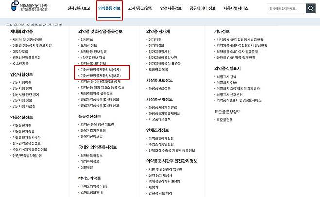확인 방법은 다음과 같다. PC로 의약품안전나라 누리집에 접속한 다음, 상단 ‘의약품등 정보’ 메뉴를 클릭한다. 이때 수많은 하위 메뉴가 출력되는데, 이중 ‘의약품 및 화장품 품목정보’에서 ‘기능성화장품 제품정보’ 메뉴를 찾을 수 있다.