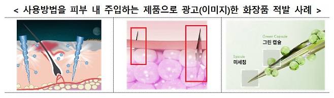 또한, 화장품은 어디까지나 인체에 ‘바르거나, 문지르거나, 뿌리는’ 형태로 사용하는 물품이다. 즉, 피부 안에 직접적으로 주입하는 식으로 사용한다는 광고는 허위·과대광고이거나 관련 법령을 위반한 사례로 봐야 한다. 실제로 식약처는 해당 분류에 속하는 화장품을 여러 차례 적발한 바 있다.