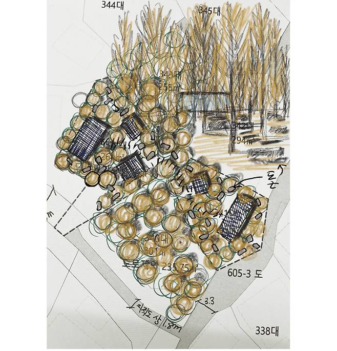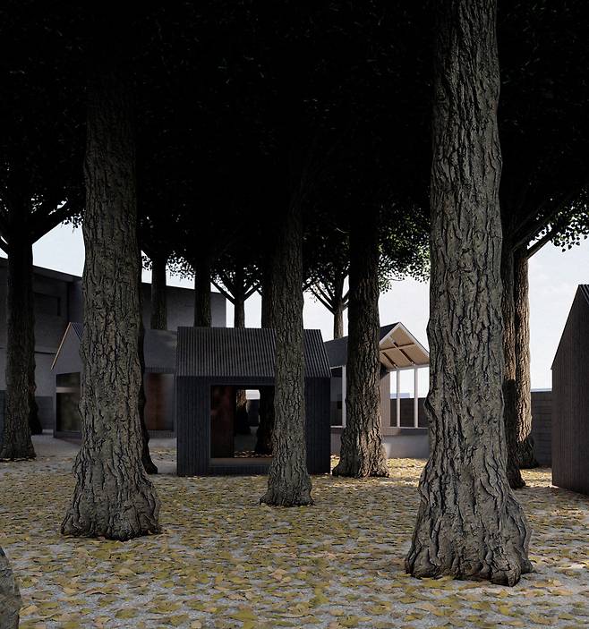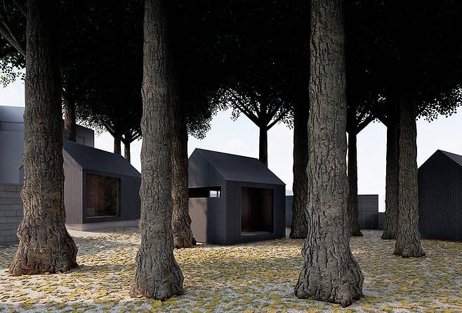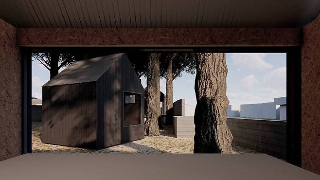 건축주는 낙우송 100그루를 심고, 나무 그늘에서 지내고 싶다고 했다. 나는 “나무 100그루를 심으면 집 지을 땅이 모자랄 텐데, 어쩌죠?”라고 물었다. 그는 멋쩍어하며 “그렇죠?”라고 대답했다. 대학에 입학한 후로 도시에서 30년 넘는 삶을 살아온 조경가가 불편하기 그지없는 이 시골로 다시 돌아오려 하는 마음은 어떤 것일까를 고민했다. 요구되는 프로그램인 방 두 개, 거실, 화장실, 서재를 시골집 구성 방식을 따라 최소 크기로 나무들 사이사이에 각각 배치했다. 불편하지만, 고향집의 감성을 닮은 집이 되기를 바랐다. 벽체는 각파이프를 구조체로 한 경량철구조로, 샌드위치패널 대신 목구조의 방식을 따라 OSB합판에 전통탄화방식인 ‘연송법’을 적용한 탄화목으로 마감하는 것을 계획했다. 내부도 OSB합판으로 마감했다.