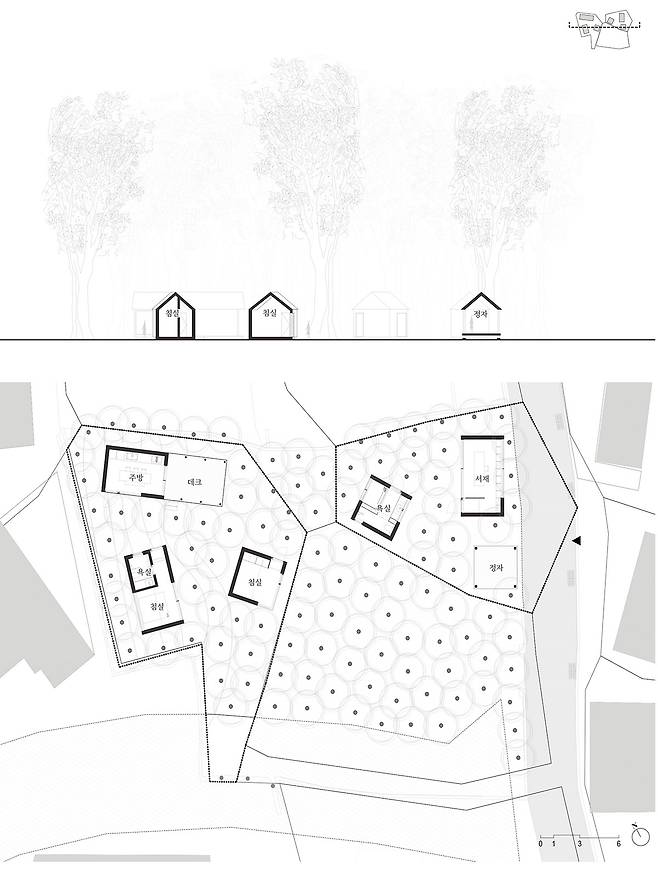 각각의 프로그램은 독립적으로 자리를 잡는다. 실내에서 낙우송 숲이 있는 밖을 보는 창은 프로그램 간 프라이버시가 보장되도록 세밀하게 계획했다. 어머님이 거주하는 공간과 건축주가 거주하는 공간의 영역을 적당히 구분했다. 마을길 쪽으로는 정자를 마련해 동네 어르신들이 쉬어갈 수 있는 공간도 마련해 뒀다.