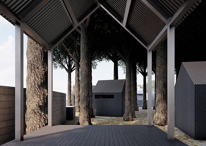 건축주는 낙우송 100그루를 심고, 나무 그늘에서 지내고 싶다고 했다. 나는 “나무 100그루를 심으면 집 지을 땅이 모자랄 텐데, 어쩌죠?”라고 물었다. 그는 멋쩍어하며 “그렇죠?”라고 대답했다. 대학에 입학한 후로 도시에서 30년 넘는 삶을 살아온 조경가가 불편하기 그지없는 이 시골로 다시 돌아오려 하는 마음은 어떤 것일까를 고민했다. 요구되는 프로그램인 방 두 개, 거실, 화장실, 서재를 시골집 구성 방식을 따라 최소 크기로 나무들 사이사이에 각각 배치했다. 불편하지만, 고향집의 감성을 닮은 집이 되기를 바랐다. 벽체는 각파이프를 구조체로 한 경량철구조로, 샌드위치패널 대신 목구조의 방식을 따라 OSB합판에 전통탄화방식인 ‘연송법’을 적용한 탄화목으로 마감하는 것을 계획했다. 내부도 OSB합판으로 마감했다.