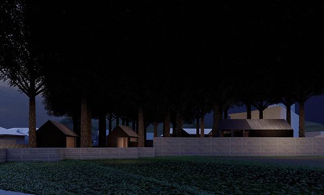 건축주는 낙우송 100그루를 심고, 나무 그늘에서 지내고 싶다고 했다. 나는 “나무 100그루를 심으면 집 지을 땅이 모자랄 텐데, 어쩌죠?”라고 물었다. 그는 멋쩍어하며 “그렇죠?”라고 대답했다. 대학에 입학한 후로 도시에서 30년 넘는 삶을 살아온 조경가가 불편하기 그지없는 이 시골로 다시 돌아오려 하는 마음은 어떤 것일까를 고민했다. 요구되는 프로그램인 방 두 개, 거실, 화장실, 서재를 시골집 구성 방식을 따라 최소 크기로 나무들 사이사이에 각각 배치했다. 불편하지만, 고향집의 감성을 닮은 집이 되기를 바랐다. 벽체는 각파이프를 구조체로 한 경량철구조로, 샌드위치패널 대신 목구조의 방식을 따라 OSB합판에 전통탄화방식인 ‘연송법’을 적용한 탄화목으로 마감하는 것을 계획했다. 내부도 OSB합판으로 마감했다.
