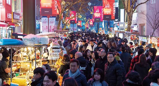 점심시간이 가까워지자 주변 직장인들이 거리로 쏟아져 나왔습니다. 외국인 관광객들은 한국인의 일상 한복판에서 함께 섞여 바쁘게 이동했습니다. 관광객이 밀집한 골목 안쪽에 K-팝 스타를 모델로 내세운 향수 브랜드의 플래그십 스토어가 자리 잡고 있었습니다.