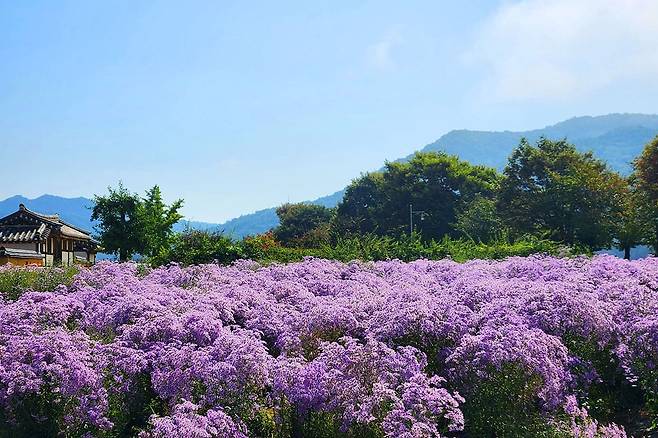 9월 초부터 피기 시작하는 개미취꽃은 9월 중순부터 10월 중순까지 절정을 이루어 마을 전체를 보랏빛 물결로 채웁니다.