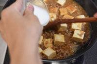 두부 1모(약 350g), 돼지고기 다짐육 150g, 생강 20g(다진 것 2스푼), 마늘 1쪽(다진 것 1작은술), 마른 고추 1개(선택), 양파 1/2개, 간장 2스푼, 미림 1.5스푼, 된장 1스푼, 물 200ml, 식용유 1스푼, 참기름 1스푼, 후추 약간, 전분물(전분 1스푼+물 2스푼)