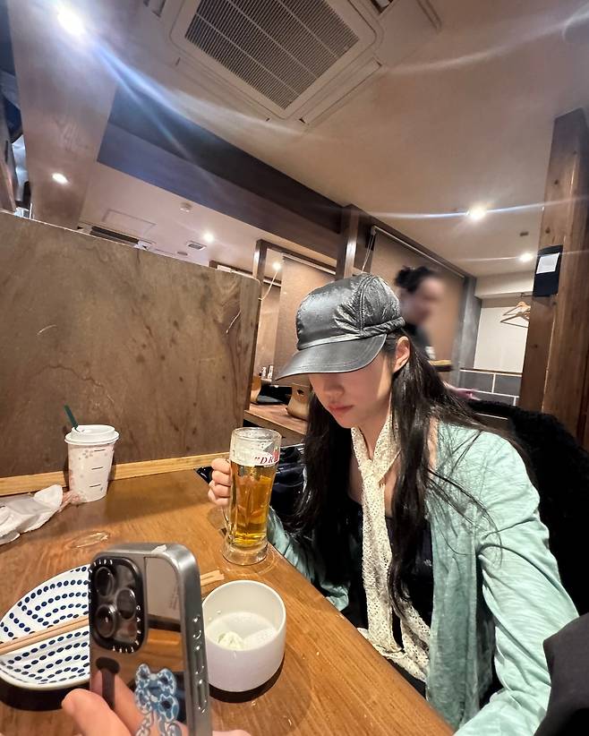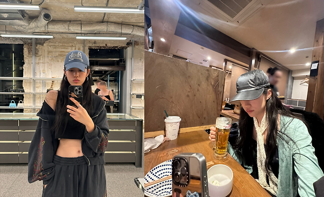 실내 공간에서 포착된 노윤서는 메탈릭한 그레이 캡과 민트 컬러의 재킷으로 독특한 분위기를 자아내고 있다. 화이트 패턴의 스카프를 목에 두른 스타일링은 클래식한 요소와 현대적인 감각이 조화를 이루고 있다. 맥주잔을 들고 있는 모습에서 여유로운 술자리 패션을 엿볼 수 있으며, 캐주얼하면서도 트렌디한 이미지를 연출하고 있다. 특히 캡 모자를 깊게 눌러쓴 스타일링은 은은한 신비로움을 더해준다.