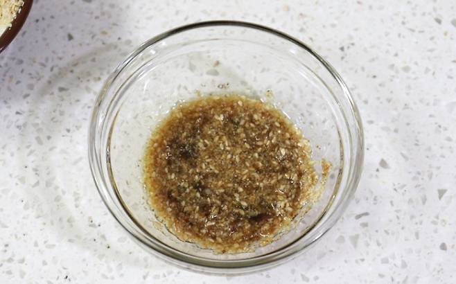 국간장 두스푼, 간마늘 반 스푼, 참기름 두 스푼, 깨소금을 넣고 섞어줍니다. 깨를 갈아서 넣으면 고소함과 풍미가 더욱 살아납니다.