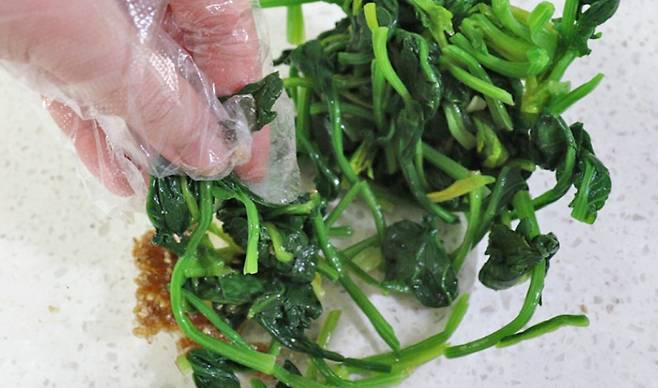먹기 좋은 크기로 자른 시금치를 볼에 담고 만들어 놓은 양념을 섞어서 시금치를 살살 풀어주며 버무려 줍니다. 초록잎채소들은 너무 주무르면 풋내가 나기 때문에 가볍게 무쳐줍니다.