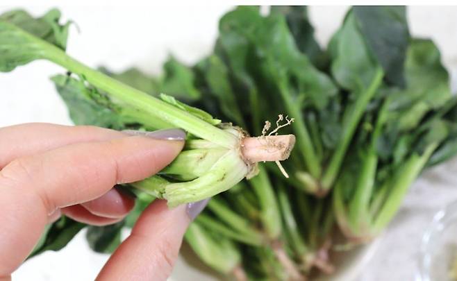 시금치는 뿌리를 자르고 흐르는 물에 충분히 씻어줍니다. 뿌리에 영양이 많기 때문에 이 부분을 자르지 않고 십자로 칼집을 내어 손질할 수도 있는데, 흙이 묻어 나올 수 있으므로 뿌리를 남길경우 깨끗하게 손질해야 합니다.