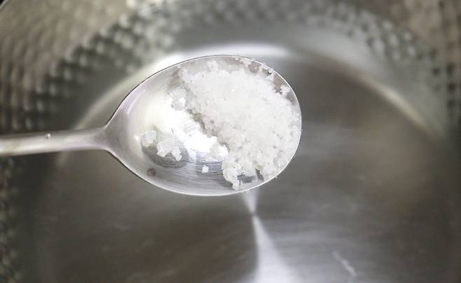 소금 반 스푼을 넣고 물을 팔팔 끓인 다음 시금치를 넣고 30초 이내로 가볍게 데쳐줍니다. 데칠때 소금을 넣으면 엽록소의 파괴를 줄여 채소의 선명한 초록색을 유지할 수 있습니다.