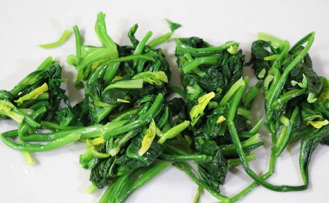 데칠 때는 뿌리 쪽부터 넣고 건저낸 후에는 바로 찬물로 헹궈 식혀줍니다.