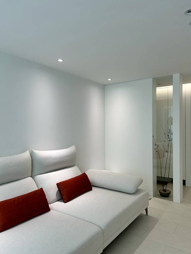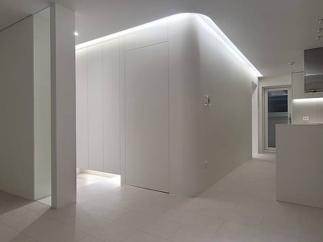 현관이 넓은 구조는 중문이 예쁘지만 좁을 때는 과감히 포기하는 것도 괜찮아요. 현관 신발장 앞 라인과 입구방 스라를 맞추었고 완전히 한 면처럼 보이기 위해 문고리 없는 히든 도어로 필름 마감했어요. 동시에 주방까지 이어지는 모서리 벽면은 라운드 형으로 굴려주고 라인 따라 간접 조명까지! 마치 갤러리 같지 않나요?