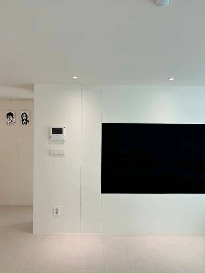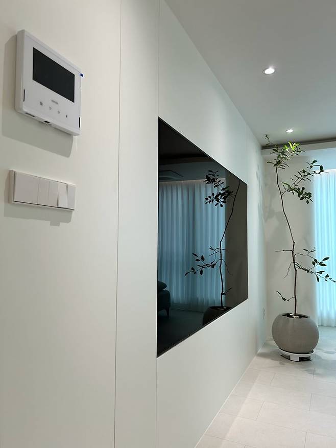 TV 공간을 완전 매립으로 해서 그런지 TV를 꺼놓을 때도 액자처럼 보여요. 필름 마감을 했는데, 필름은 이음새 공간을 만들어줘야 해서 직선이 몇 가닥 있어야 한대요. 싫어하시는 분들도 계시겠지만 저는 이음새 직선이 너무 매력 있게 보이더라고요! 은근한 포인트를 주는 듯해요.