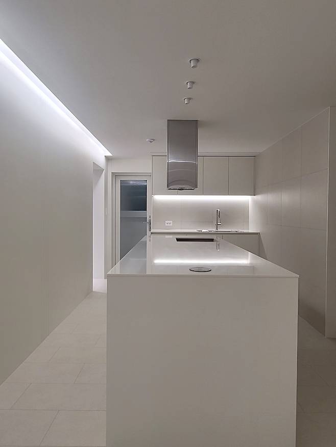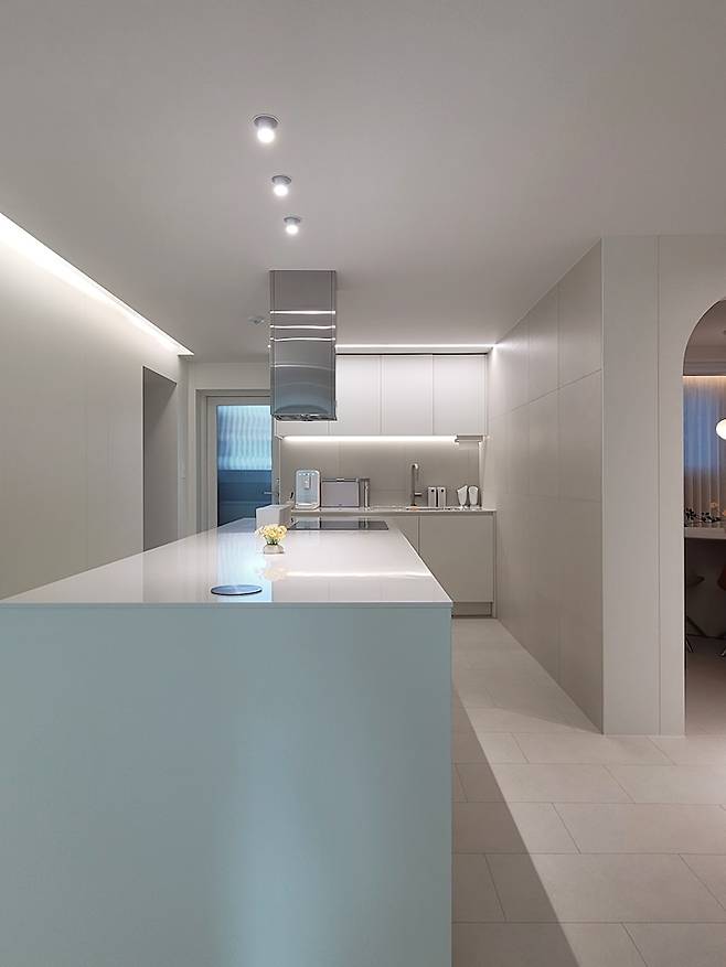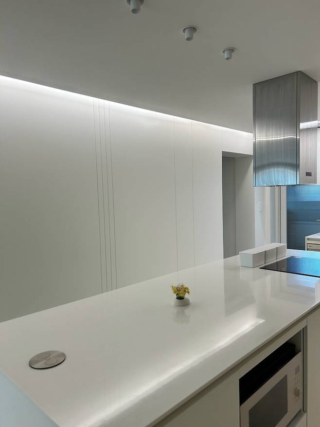 식탁을 다이닝룸으로 따로 빼다 보니 주방 조리공간이 정말 넓어졌어요! 현관에서 주방으로 넘어가는 이음새는 라운드로 포인트를 주고 그 위로 이어진 간접조명이 집안의 무드를 좌우하는 것 같아요.