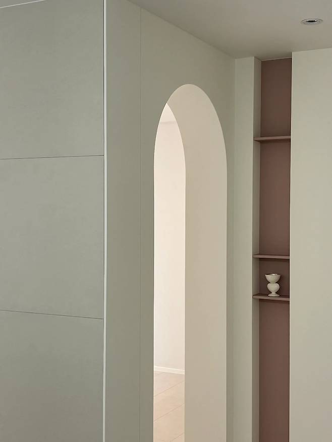 인테리어 미팅을 하면서 가장 먼저 외쳤던 요구사항은 아치 게이트였어요. 왜 때문인지는 모르겠지만 저 동그란 느낌이 너무 예뻐 보여서 저희 집 가장 잘 보이는 공간에 만들어 주었고, 필름 마감했어요.