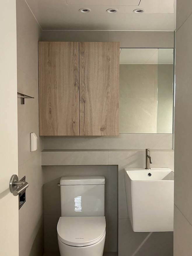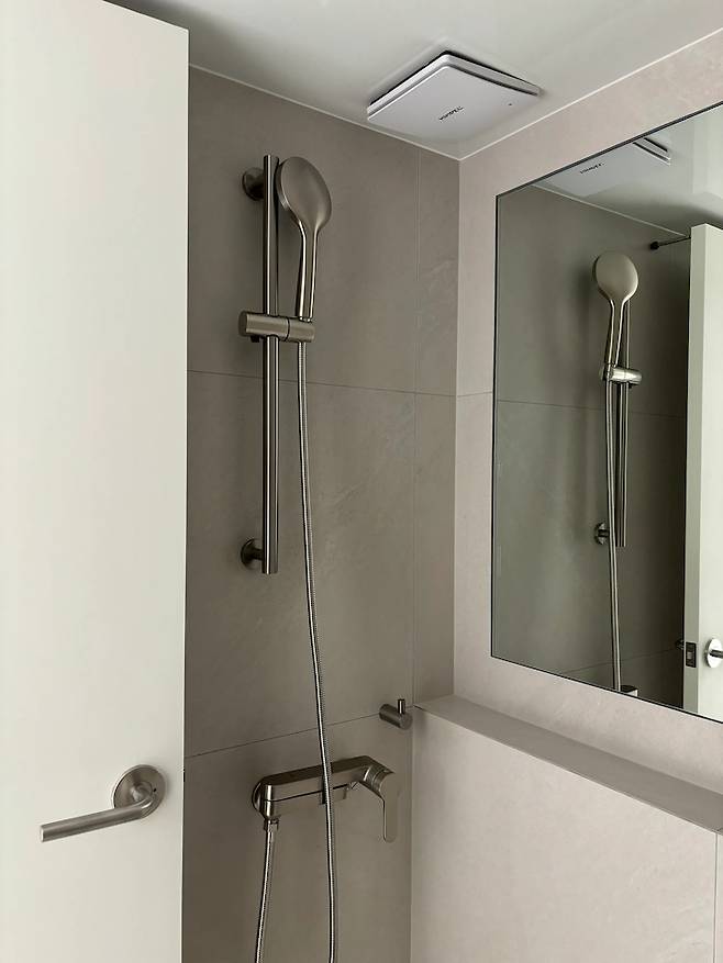 안방 화장실이에요. 저희 집은 특히 화장실이 매우 협소한 편이에요. 그래서 세면대는 과감히 철거했고 안방 화장실은 남편 샤워 전용이라 차라리 샤워를 넓게 하자!라는 생각이었어요. 거울도 깔끔하게 매립 거울로 했어요. 환풍기는 전동 댐퍼를 추가로 설치해서 혹시 모를 악취를 대비해 사용 중인데 효과가 좋은 것 같아요.