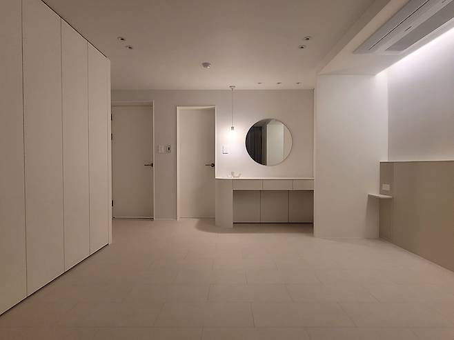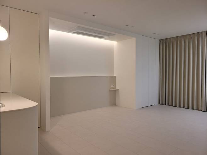 짧은 가벽을 세워둬서 조금 더 아늑한 느낌을 가질 수 있어 하길 잘 했다는 생각이에요. 시스템에어컨으로 인해 단 내림을 한 곳에 간접등으로 무드등 포인트를 주어서 자기 전 담소 나눌 때 잘 활용하고 있어요.