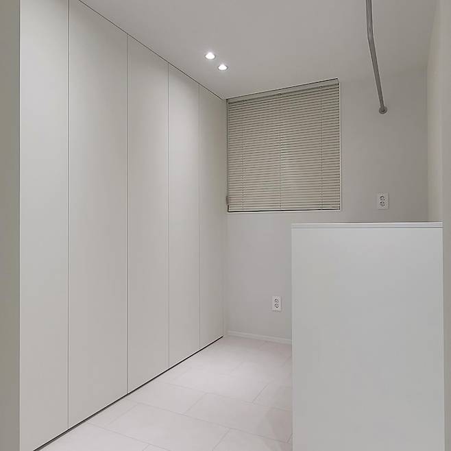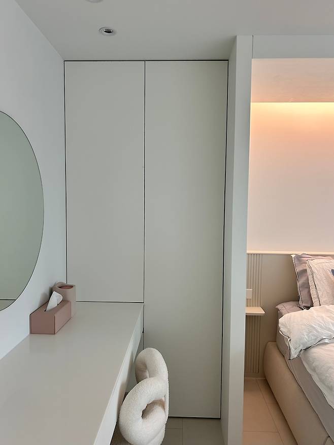 침대 쪽에도 내력벽이 있었기 때문에 그 옆으로는 장을 또 하나 짜주었어요. 두껍고 긴 겨울 코트를 넣기에 딱인 사이즈입니다. 그래서 저희 집은 2인 가구 기준 수납이 정말 넉넉한 편이에요.