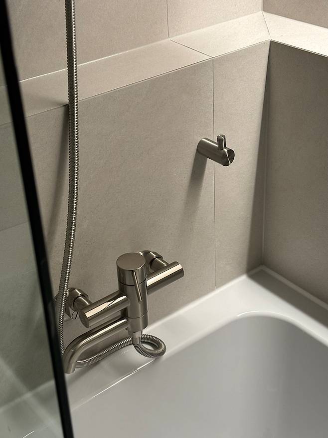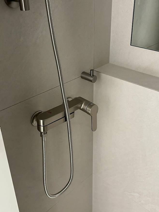 한때는 모두가 유광 수전을 사용했던 것 같은데, 요즘엔 무광 수전이 훨씬 잘 나간대요. 옆에 샤워볼 걸이도 너무 앙증맞죠. 세면 수전과 동일하게 둥근 디자인으로 맞추었어요.