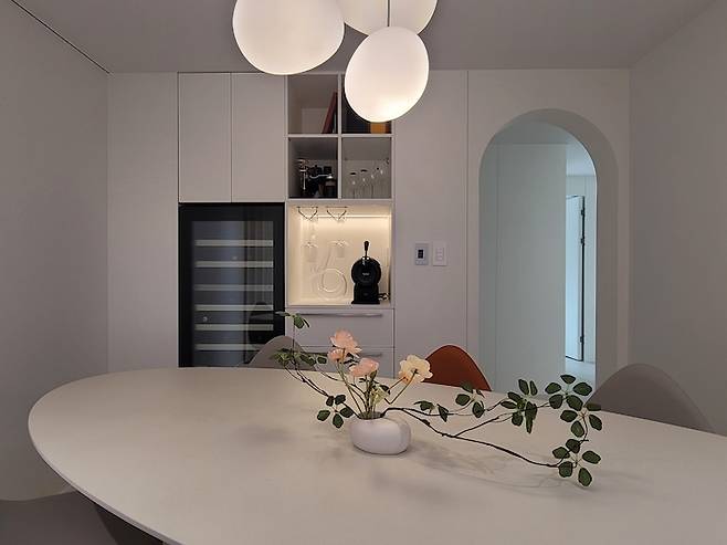 주방 바로 옆에 있는 방은 문을 제거하고 아치 게이트로 만들어 다이닝 룸으로 활용했어요. 기존 붙박이장 자리에 와인셀러와 와인잔, 위스키 등을 진열할 수 있는 진열장으로 꾸몄어요.