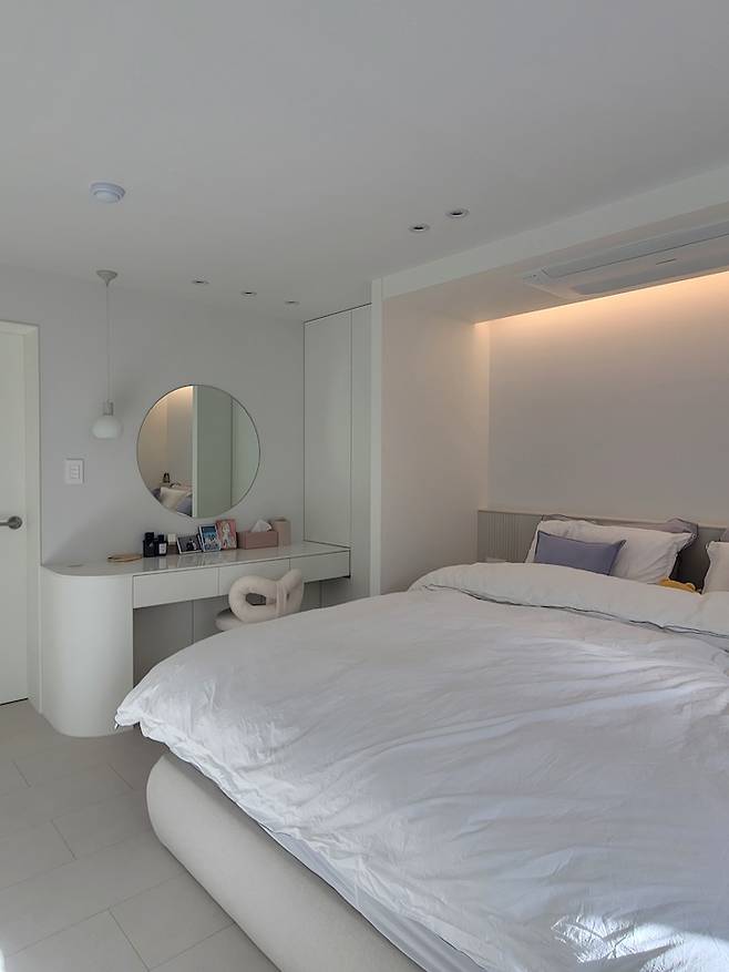 화장대와 침대 옆에는 짧은 가벽을 세워주고 남는 공간은 옷 수납을 위한 키 큰장과 상부장으로 헤어드라이기나 상비약 등 잡동사니를 넣을 수 있도록 장을 만들었어요. 발밑처럼 얕은 공간도 수납장으로 해두면 작은 것 하나라도 넣을 수 있어요. 수납은 많을수록 좋죠!