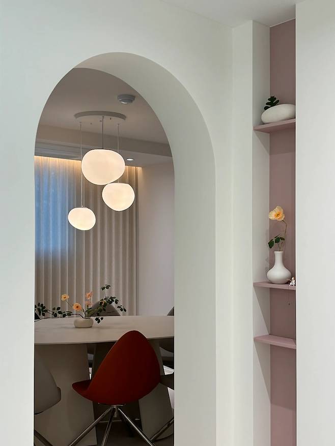 아직은 아이가 없기 때문에 오로지 저희 부부의 라이프스타일에 초점을 두었고, 저의 오랜 로망이었던 광폭 아일랜드를 실현하기 위해 주방과 다이닝 공간에 힘을 주었던 것 같아요. 아이보리&베이지로 톤온톤 색감을 맞추고 곳곳에 라운드 벽면으로 포인트를 주었습니다.