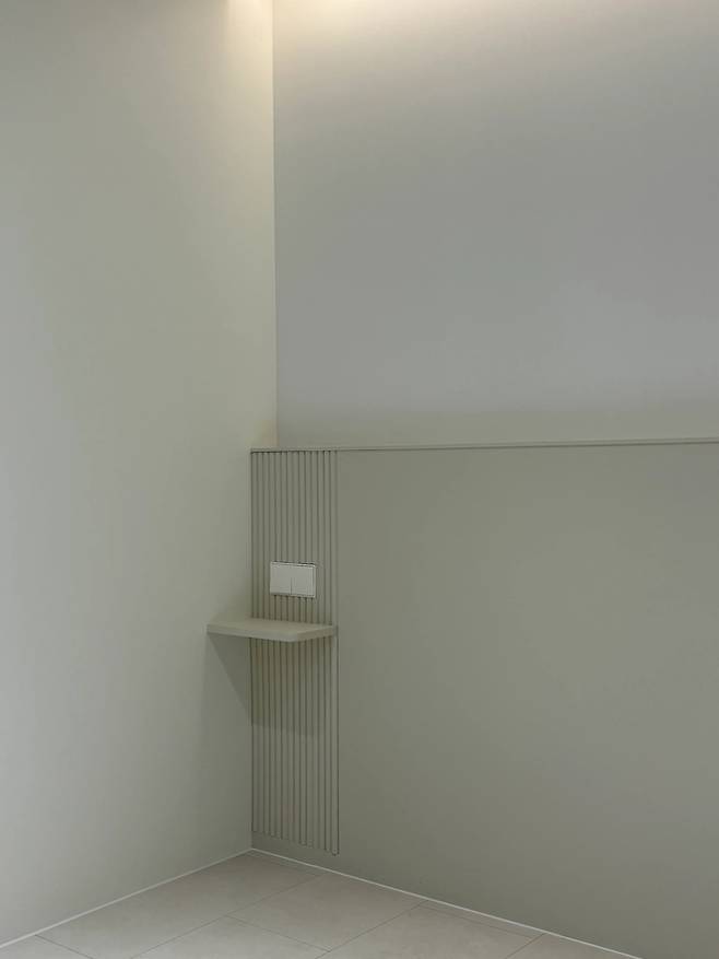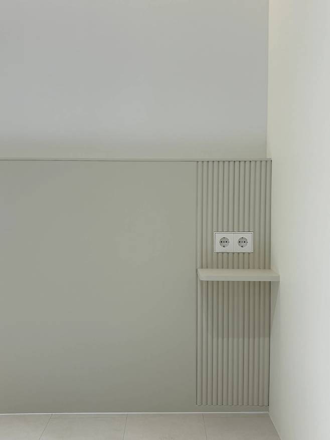한 쪽 면은 무드등 스위치가 있는데 융 스위치와 히든 콘센트 커버로 매끈한 포인트를 주었죠.