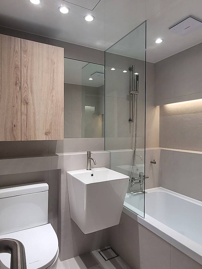나중에 생길 아이를 위해서 욕조는 남겨두었어요. 조적 파티션을 하고 싶었지만 욕실이 협소해 유리 파티션으로 대체했고, 샤워할 때 물이 튀지 않아 좋아요.